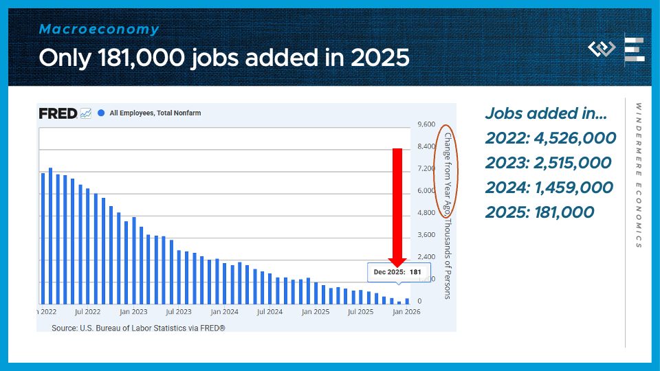 I’ll start with some bad news and some good news from the latest jobs report. The first number to know this week is the bad news: 181,000. That’s the total number of jobs added in the entire year of 2025, according to the latest data from the Bureau of Labor Statistics, which follow a standard annual revision updating their models to match more accurate but less timely data sources. These revisions drove home the conclusion that job growth basically stalled out in 2025, and was much worse than even the weak monthly payrolls reports were showing us. That total job growth compares to previous annual totals in the millions, although the trend of slowing growth has been clear for quite some time.