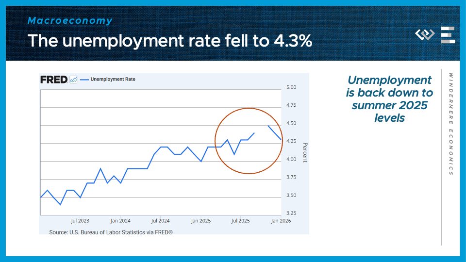 The second number to know this week was the good news in the latest jobs report: 4.3%. That’s the unemployment rate in January, which stepped down again, from a high in November of 4.5%, bringing it back down to summer 2025 levels. That’s one indication that the labor market MAY have begun to turn the corner this winter, with some modest improvement to start the year after several straight months of weakening. These are just preliminary numbers, but coupled with what we know will be strong economic tailwinds from the huge tax cuts in last year’s budget bill, the stage seems to be set for stronger economic growth this spring.
