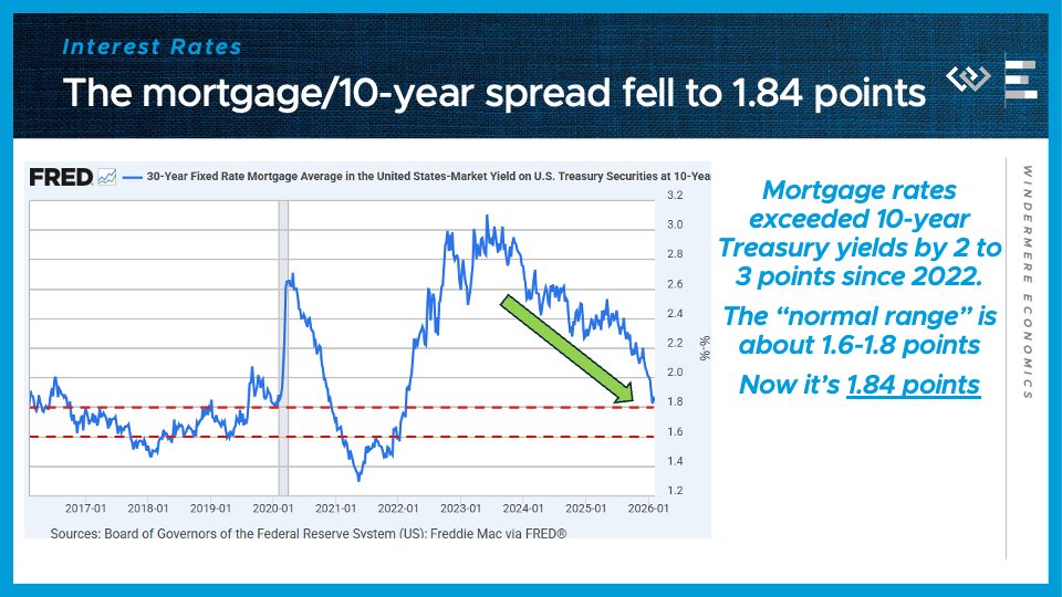 The third number to know right now: 1.84 percentage points. That was the average spread, or how much higher 30-year mortgage rates were than the benchmark 10-year Treasury yield in the first week of February. That means we are knocking at the door of a normal spread after almost four years of a really abnormally wide spread. This was a major culprit in the pain that homebuyers felt trying to get a mortgage. Last month I talked about the surprise announcement that Fannie Mae and Freddie Mac would be buying mortgage-backed securities, and I think the proof is in the pudding that the news of that purchasing plan helped bring this spread down by that last 30 basis points just in the last month.