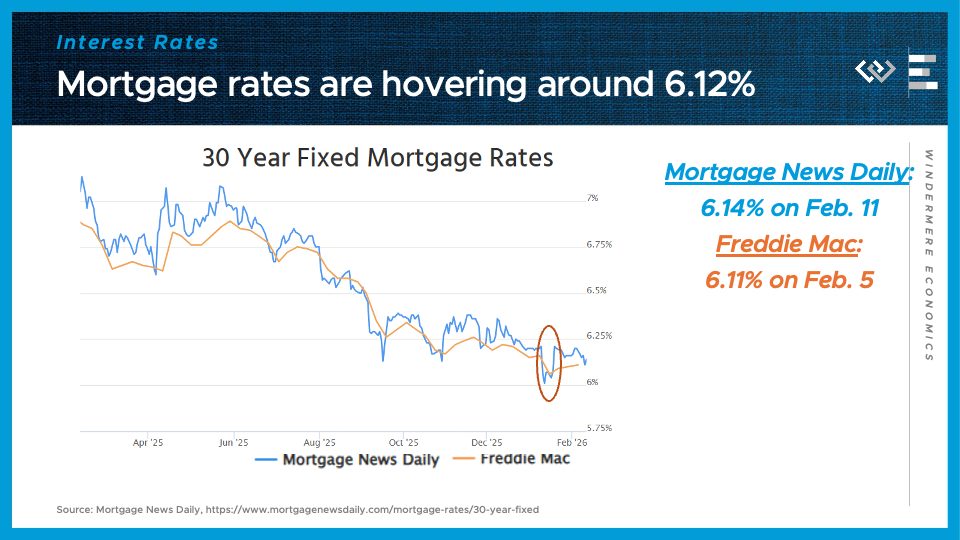 So where are mortgage rates now? Well, they’ve been hovering around 6 and an eighth all year, which is an improvement from this time in 2025 of at least half a point, maybe ¾ or a whole point, for most borrowers. I think the takeaway here is that we’ve now seen most of the improvement to mortgage rates that we were expecting from that spread closing, which is a little bittersweet – it’s great news that it happened, but now that potential avenue for rate improvement has run its course, which makes me less optimistic about prospects for further rate declines in the near term. It’ll depend instead on the overall interest rate and inflation environment cooling down, and those prospects look a lot dicier: the big increase in borrowing that the budget bill is kicking off this year will tend to push up Treasury yields, and the boost to economic growth should also keep inflation elevated. So my takeaway for anyone considering a mortgage is that rates have come down a lot, and there’s no point waiting on the sidelines in hopes of further declines, given what we can expect in the year ahead.